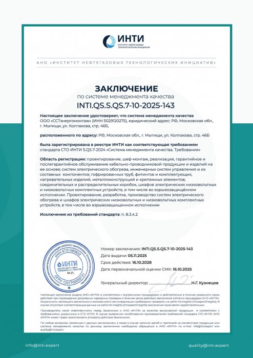 «ССТэнергомонтаж» (входит в Группу компаний «Специальные системы и технологии»), крупнейшая российская инжиниринговая компания, специализирующаяся на комплексных решениях в сфере систем электрообогрева и промышленной безопасности, получила заключение АНО «Институт нефтегазовых технологических инициатив» (ИНТИ) о соответствии системы менеджмента качества (СМК) требованиям отраслевого стандарта СТО ИНТИ S.QS.7-2024 «Система менеджмента качества. Требования».